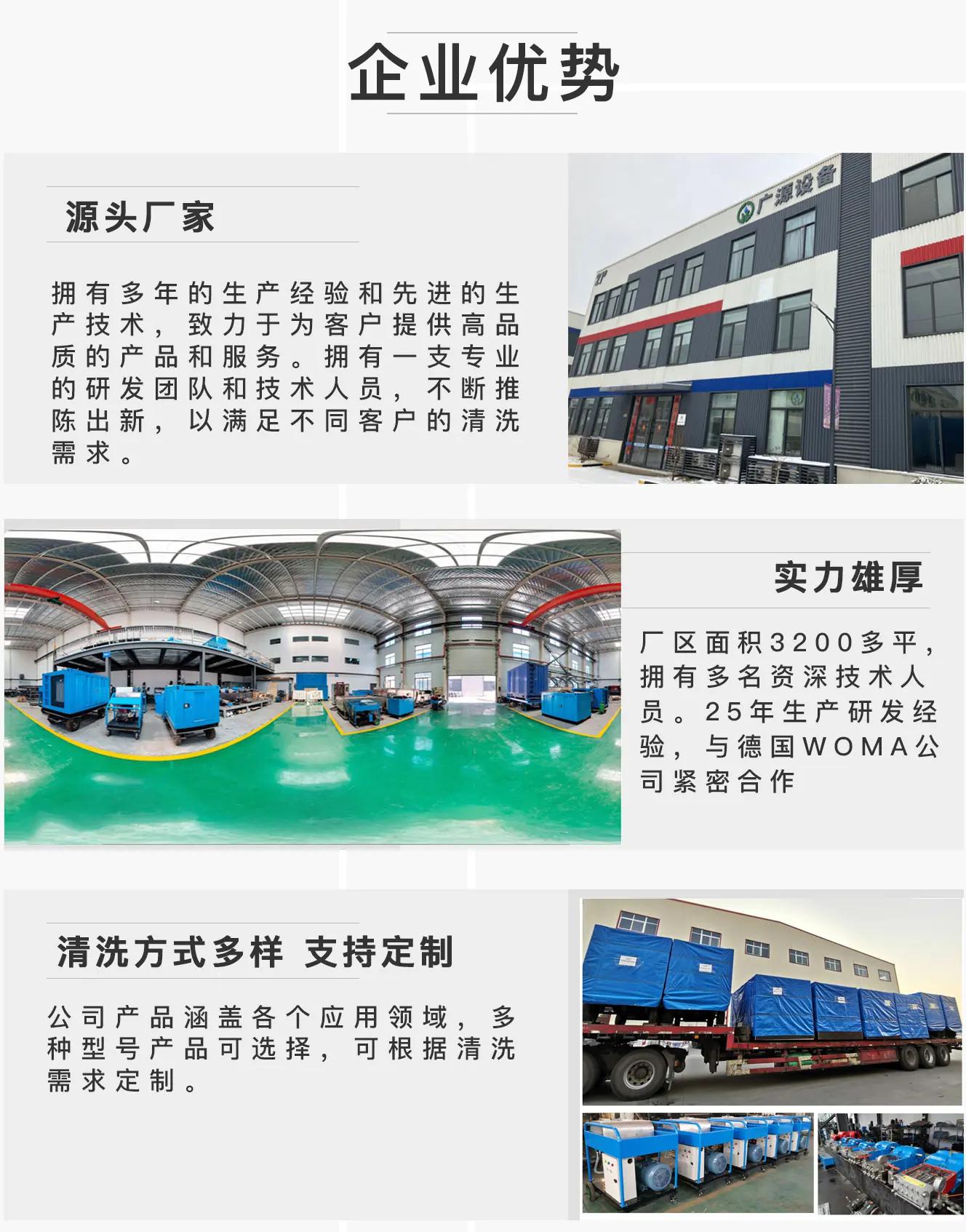 郑州广源清洗设备依托十余年行业经验,是一家集研发、生产和销售为一体的高科技公司,为多领域提供自动清洗机、智能清洗机器人、超高压清洗系统、管道清洗机、水刀引孔设备、除锈清洗机、拉毛机、破碎机器人等集成设备及相应技术支持与服务。着眼世界领军技术,与水射流清洗行业巨头KAMAT合作,不断提升我公司优良产品性能的质量体系。 公司非常重视产品的研发合作,与多家科研院所紧密合作,使产品畅销全球,并逐步同国际制泵水平接轨。