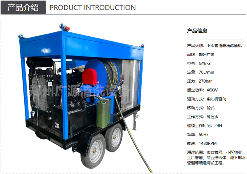 产品描述:这款下水管道高压疏通机,采用柴油驱动,无需外接电源,作业灵活稳定,可疏通各类下水管道堵塞、淤积与结垢,广泛适用于市政管网、小区物业、工厂管道、商业综合体及地下排水管道等疏通清淤场景。
